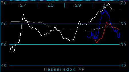 ![]() The above graph shows the temperature as measured at our offices in Nassawadox. The white line shows the actual temperature over the last three to four days. The red line shows the average temperature for the past week. The blue line shows the average temperature for this week each year since 1998. The grey line is the water temperature of the Chesapeake Bay.