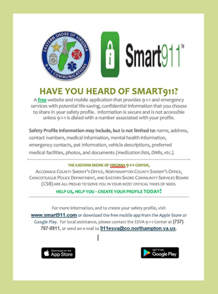 Individuals are encouraged to create their free Safety Profile with Smart911 today to have their information immediately available to 9-1-1 and to receive emergency notifications. Smart911 is private and secure, and information is only made available to the 9-1-1 system in the event of an emergency call. To create a Smart911 profile for yourself and your family, visit www.smart911.com. You may also download the free mobile app from either Google Play for Android devices or the App Store for Apple devices. For profile assistance or questions, individuals may contact the Eastern Shore of Virginia 9-1-1 Center’s non-emergency line at (757) 787-0911 or e-mail 911esva@co.northampton.va.us.
