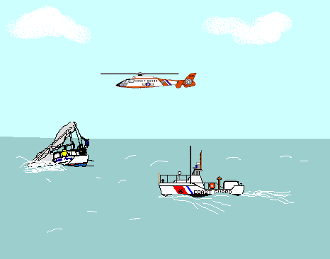 A HH-65 Dolphine does a hoist as a 41 foot utility boat approaches a burning
