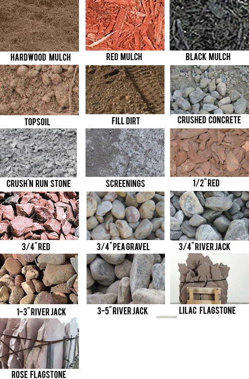 We have a wide range of products in stock and can easily source and deliver any materials that you need. Mulch, stones, fill dirt, topsoil - we sell it all! Here are some samples of materials we sell. If you need something else, just ask and we'll get it for you. fills