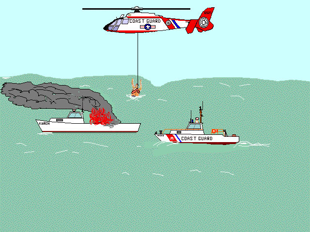 A HH-65 Dolphine does a hoist as a 41 foot utility boat approaches a burning
